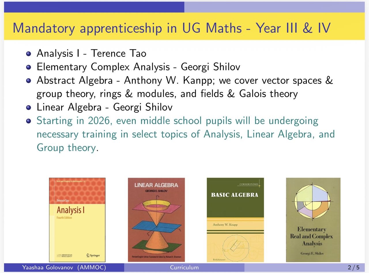 At the present, Parth Andhare, Madani Valensi, Raeyaan Muppaneni, Shaurya Patil, Vibhu Kumar, and Sergei Makarevich are undergoing training in mathematical analysis, geometries, differential geometry, and abstract algebra from the viewpoint of category theory.